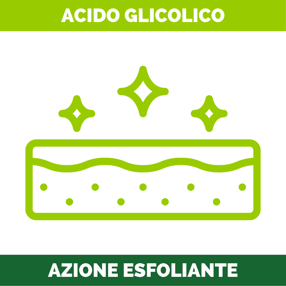 L'Acido Glicolico viene prodotto a partire da canna da zucchero o barbabietola e ha un pH abbastanza basso, compreso tra 3 e 4. Ha l'effetto di rimuovere le cellule morte della pelle ha un'azione esfoliante e migliora l'aspetto di essa, rendendola più liscia e luminosa. Può anche aiutare a ridurre l'aspetto di macchie scure, cicatrici da acne e rughe leggermente profonde.