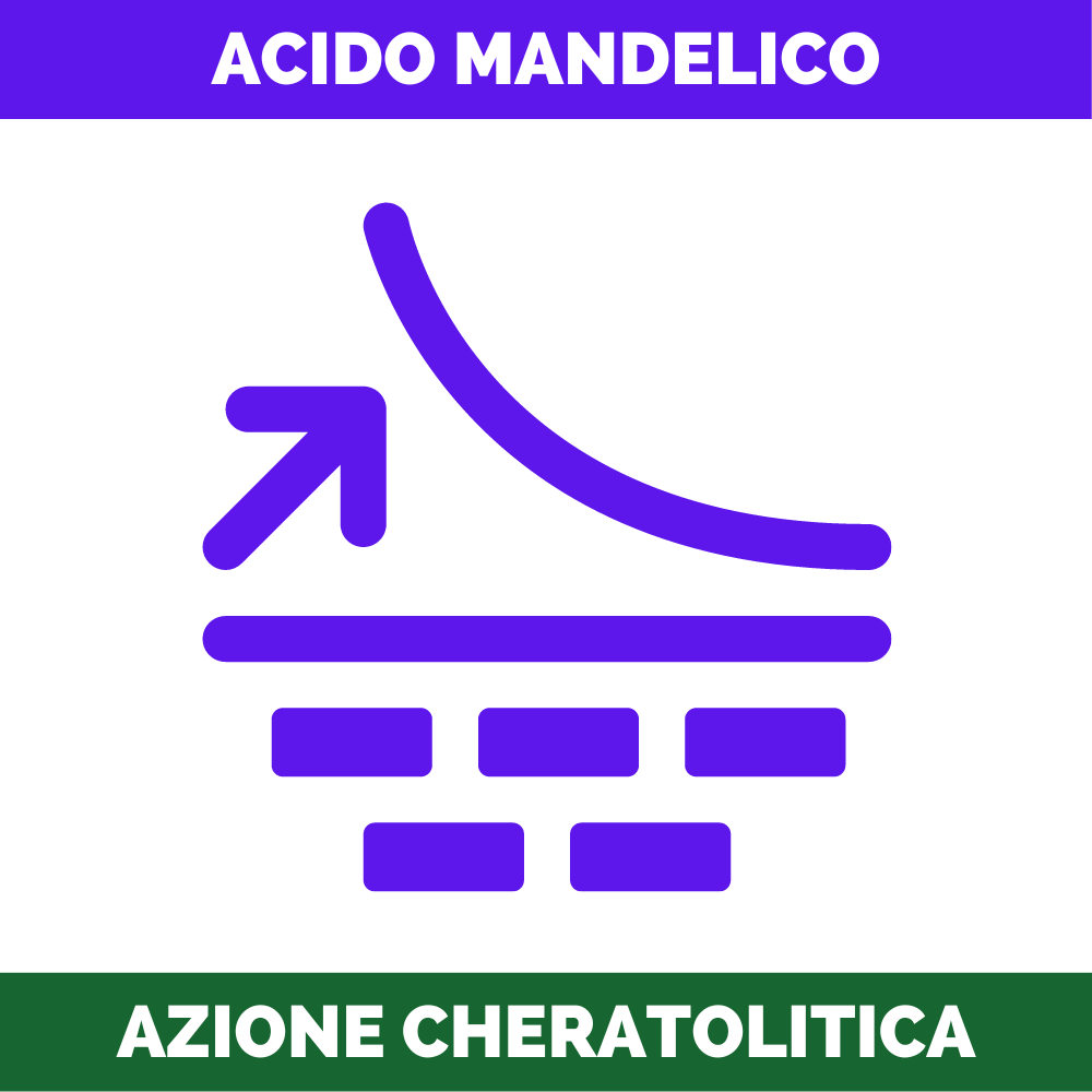 L'acido mandelico ha la capacità di esfoliare delicatamente la pelle, rimuovendo le cellule morte e rendendo la pelle più liscia e luminosa. Grazie a questa azione cheratolitica può aiutare a rimuovere lo strato superficiale di cheratina dalla pelle. Secondo alcuni studi, l'acido mandelico può essere efficace nel trattamento dell'acne leggera e moderata, poiché ha proprietà antibatteriche e sebo-regolatrici