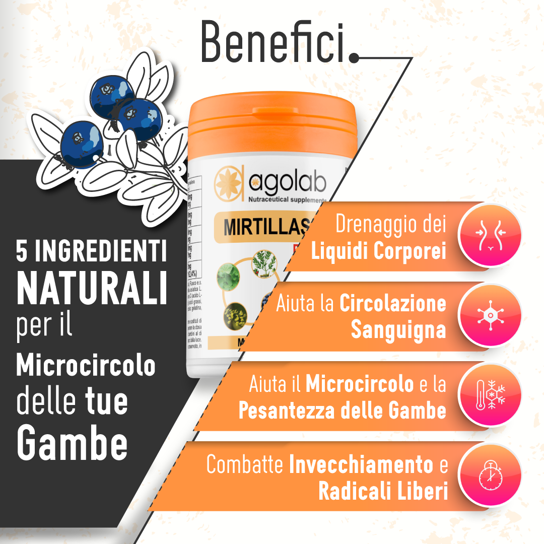 Integratore alimentare a base di mirtillo nero, rusco, centella asiatica, meliloto e vitamina C. Mirtillo nero e centella sono utili alla funzionalità del microcircolo (pesantezza delle gambe). Il meliloto è utile per il drenaggio dei liquidi corporei e insieme al rusco contribuisce alla funzionalità del plesso emorroidario. La vitamina C contribuisce alla protezione delle cellule dallo stress ossidativo.