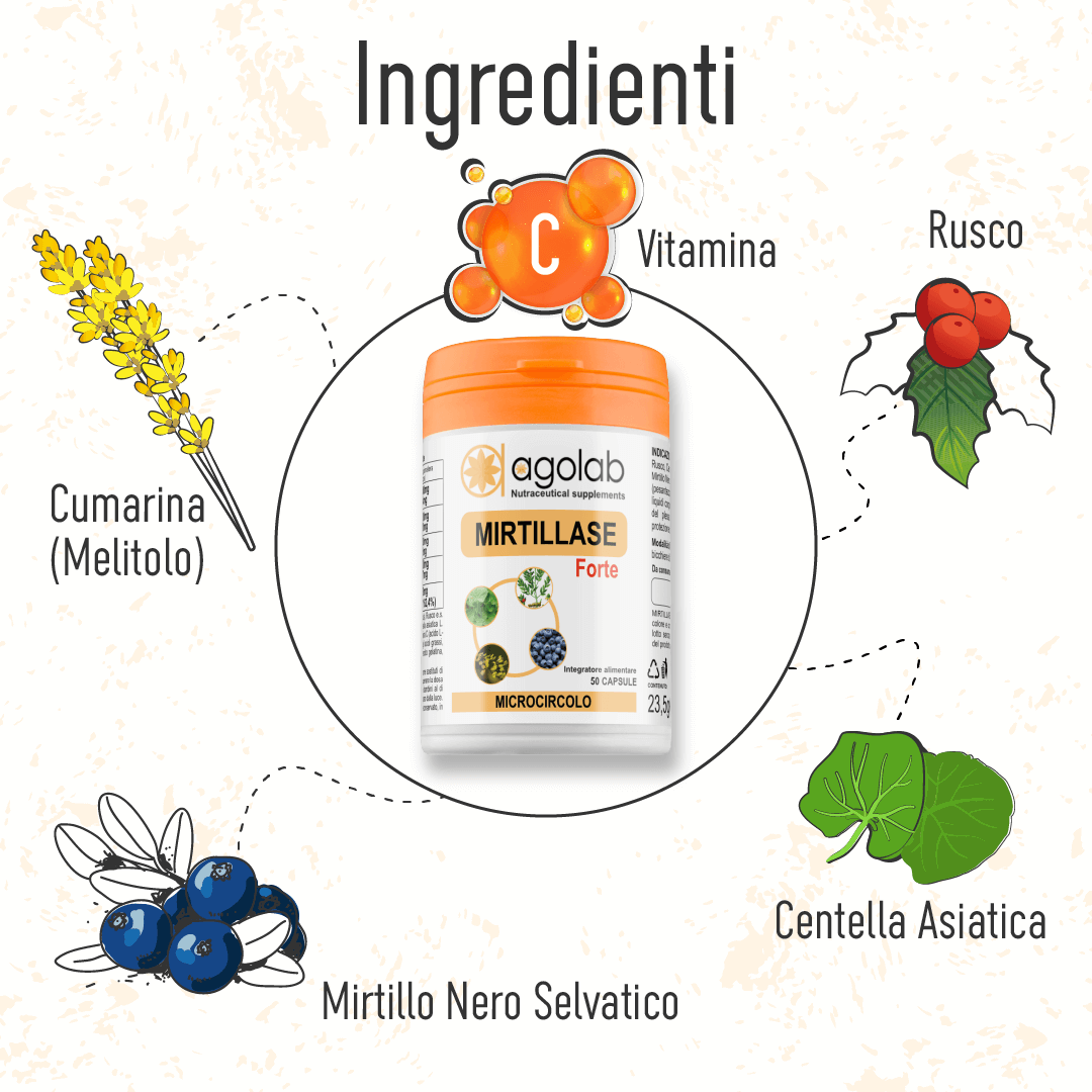 Mirtillo nero e.s. (Vaccinium myrtillus L. fructus) tit. al 1% in antocianosine, rusco e.s. (Rusco aculeatus L. radix) tit. al 5% in ruscogenina, centella asiatica e.s. (Centella asiatica L. folium) tit. al 5% in asiaticoside, meliloto e.s. (Melilotus officinalis L. floribus) tit. al 17% in cumarina, vitamina C (acido L-ascorbico); agenti antiagglomeranti: sali di magnesio degli acidi grassi, biossido di silicio, talco, amido di mais; costituenti dell'opercolo: gelatina; colorante: biossido di titanio.