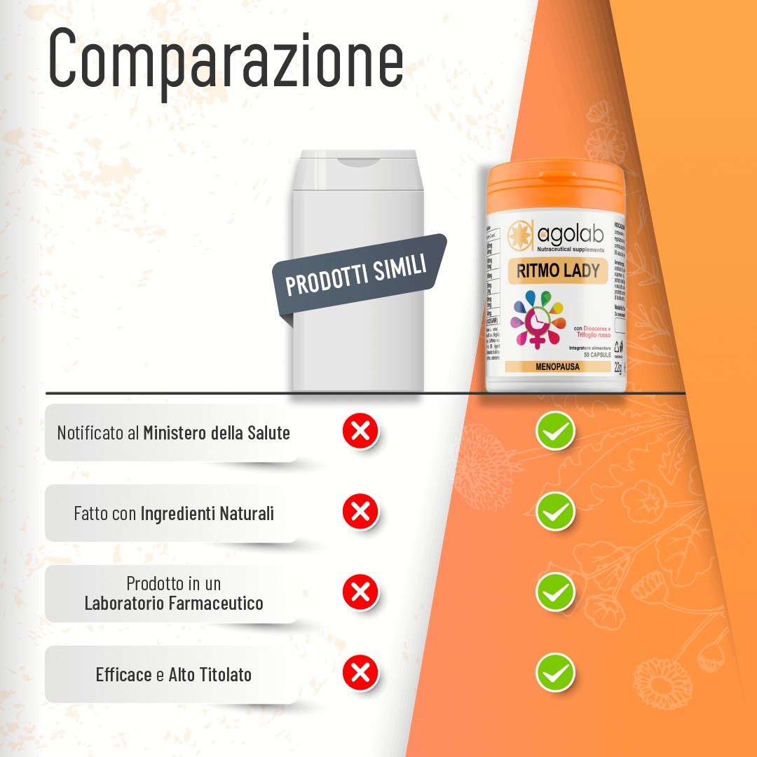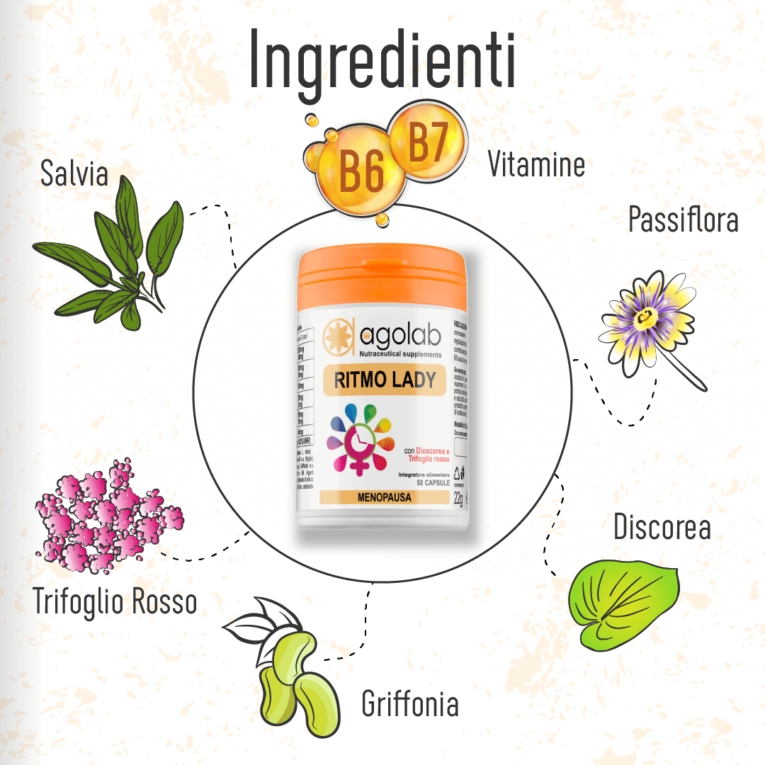 Integratore alimentare a base di trifoglio rosso, dioscorea, griffonia, salvia, passiflora e vitamina B6, utile per contribuire a contrastare i disturbi della menopausa e regolare il processo di sudorazione, per contribuire al benessere mentale e al rilassamento, per aiutare a regolare l'attività ormonale.