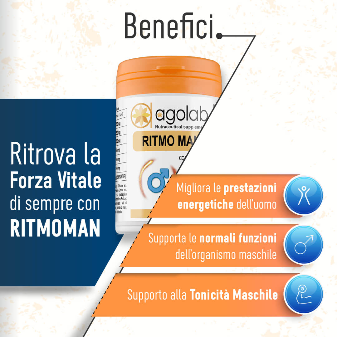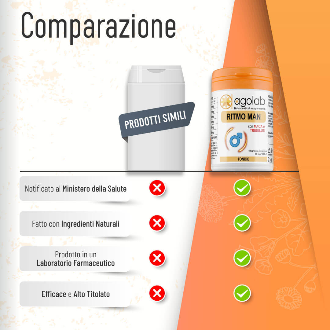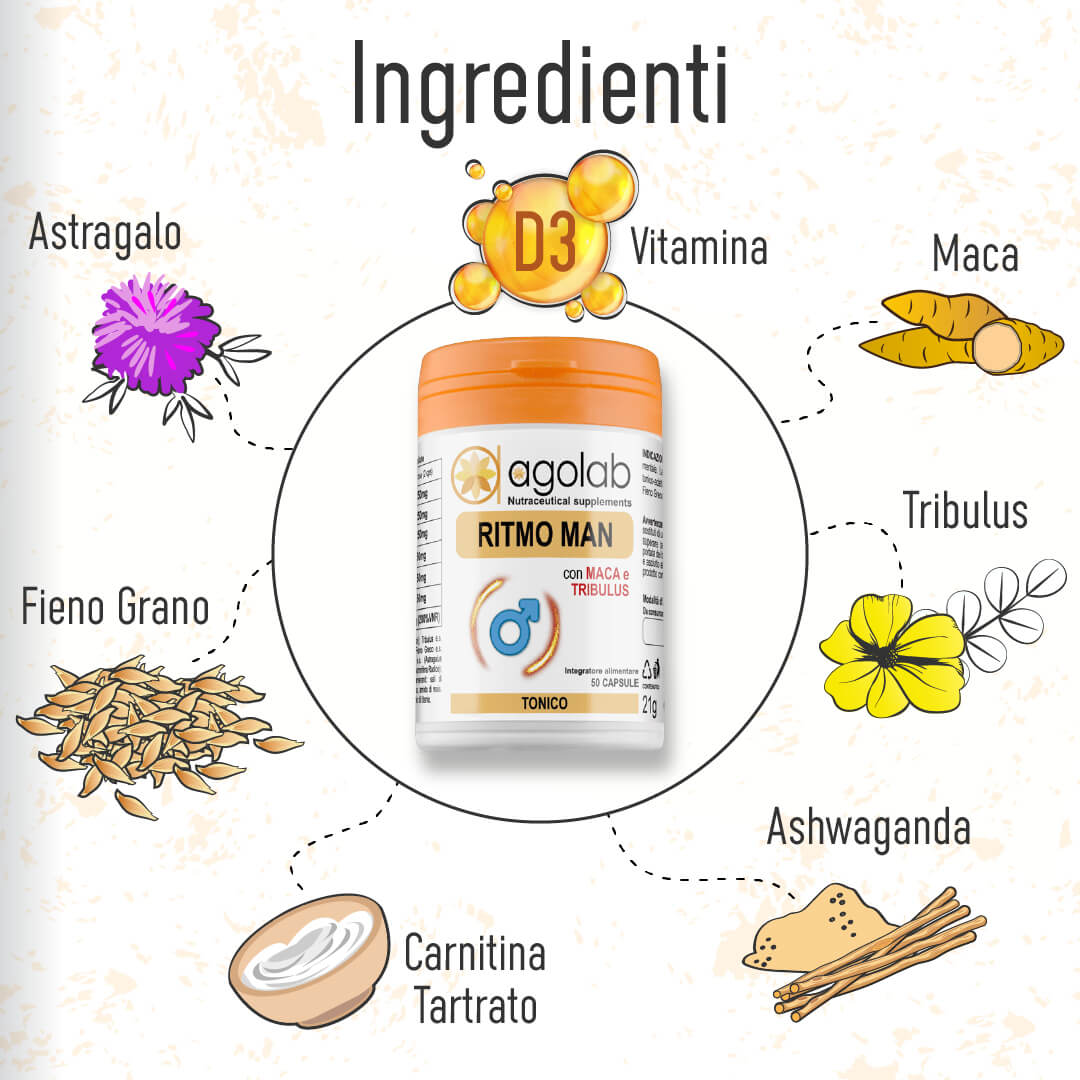 Maca e.s. (Lepidium meyenii radice), tribulus e.s. (Tribulus terrestris frutti), carnitina L-tartrato, fieno greco e.s. (Trigonella foenum-graecum semi), astragalo e.s. (Astragalus membranaceus radice), ashwagandha e.s. (Withania somnifera radice), vitamina D3 (colecalciferolo); agenti antiagglomeranti: sali di magnesio degli acidi grassi, biossido di silicio, talco, amico di mais. Costituenti dell'opercolo: gelatina; colorante: biossido di titanio.