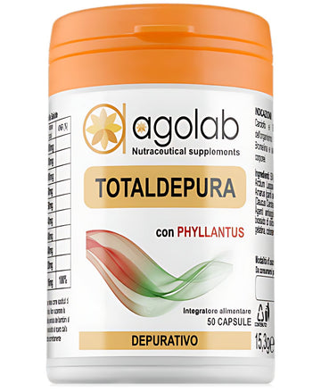 Agolab Total Depura. Integratore in capsule naturale ad azione depurativa sull'organismo. Con aggiunta di glutatione, SOD, inositolo ad azione antiossidante. Formato: confezione 50 capsule.