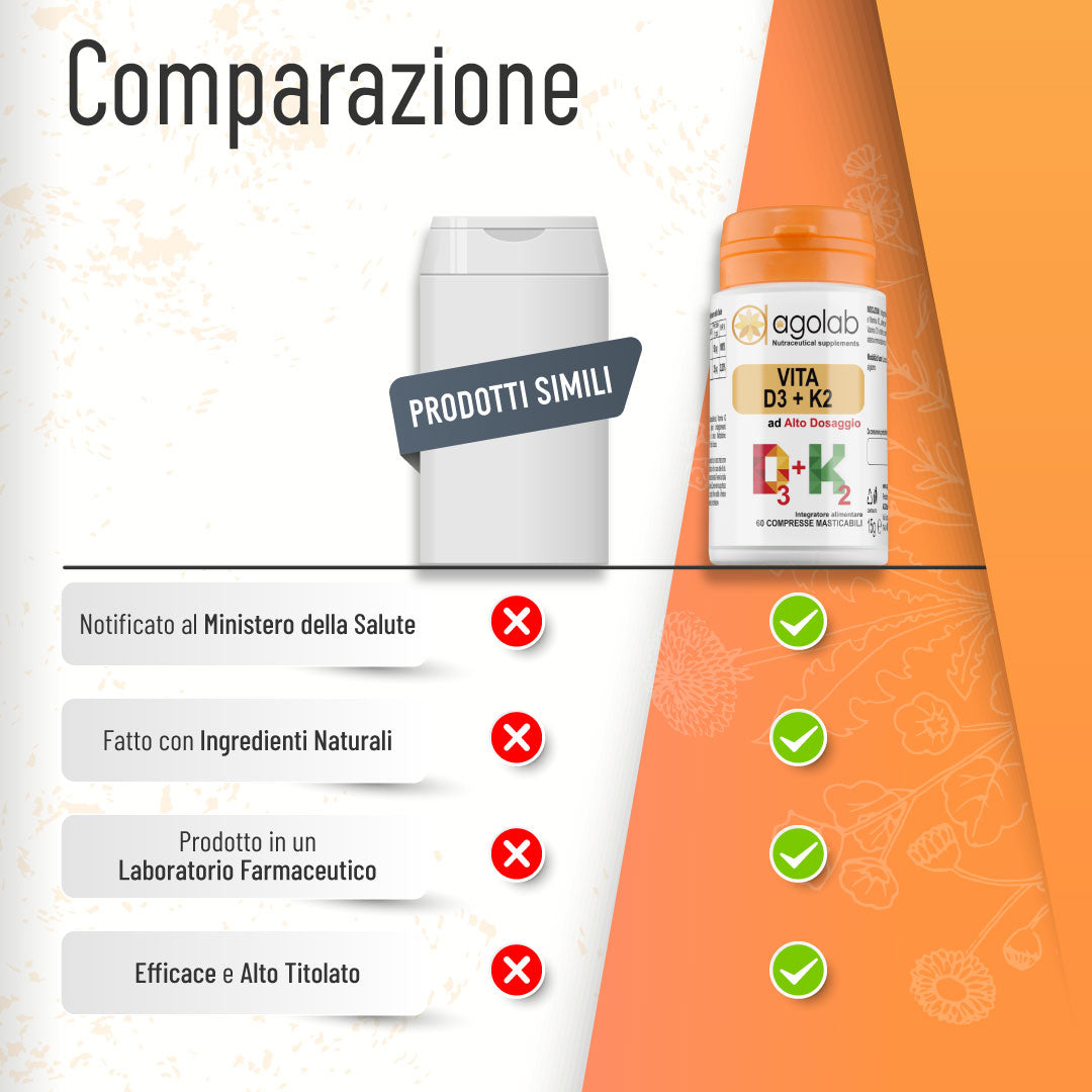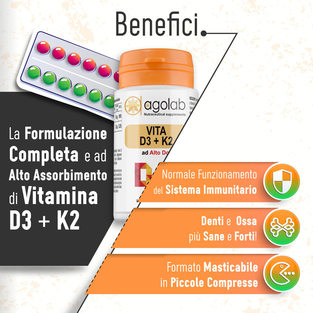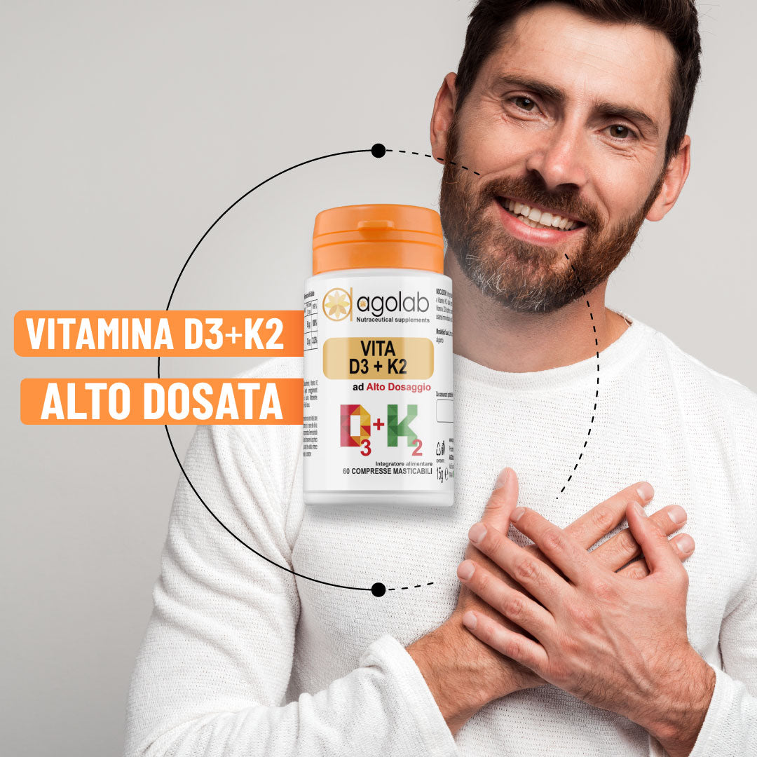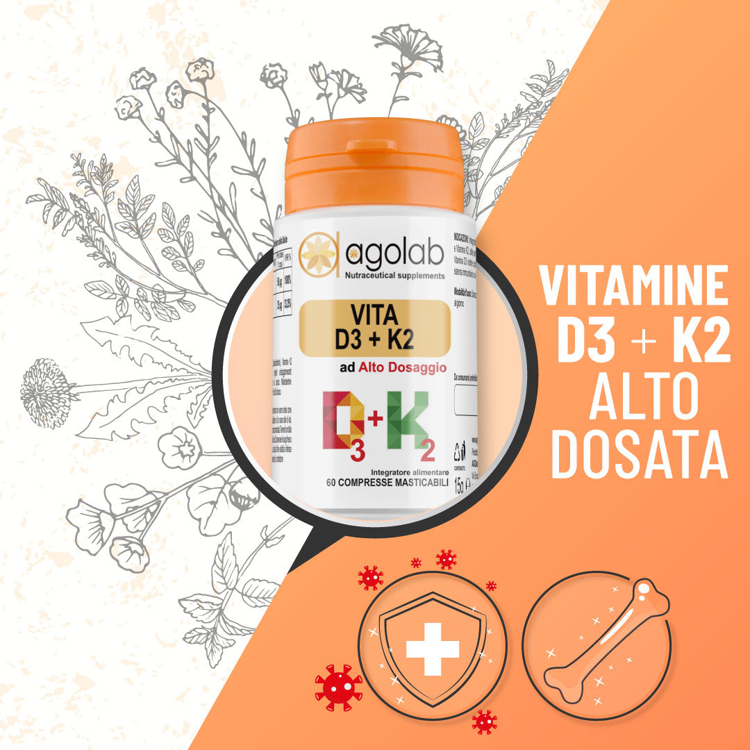 Integratore alimentare a base di vitamina D3 e vitamina K2, utile per la buona salute di ossa e denti.