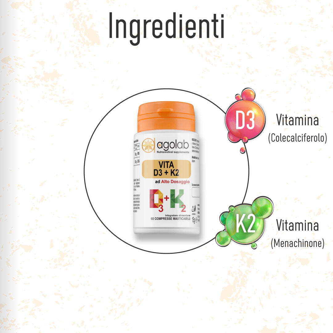 Vitamina D3 (colecalciferolo), vitamina K2 (menachinone), mannitolo; agenti antiagglomeranti: magnesio stearato; agenti di carica: maltodestrine; edulcorante: levulosio; aromi: frutti di bosco.